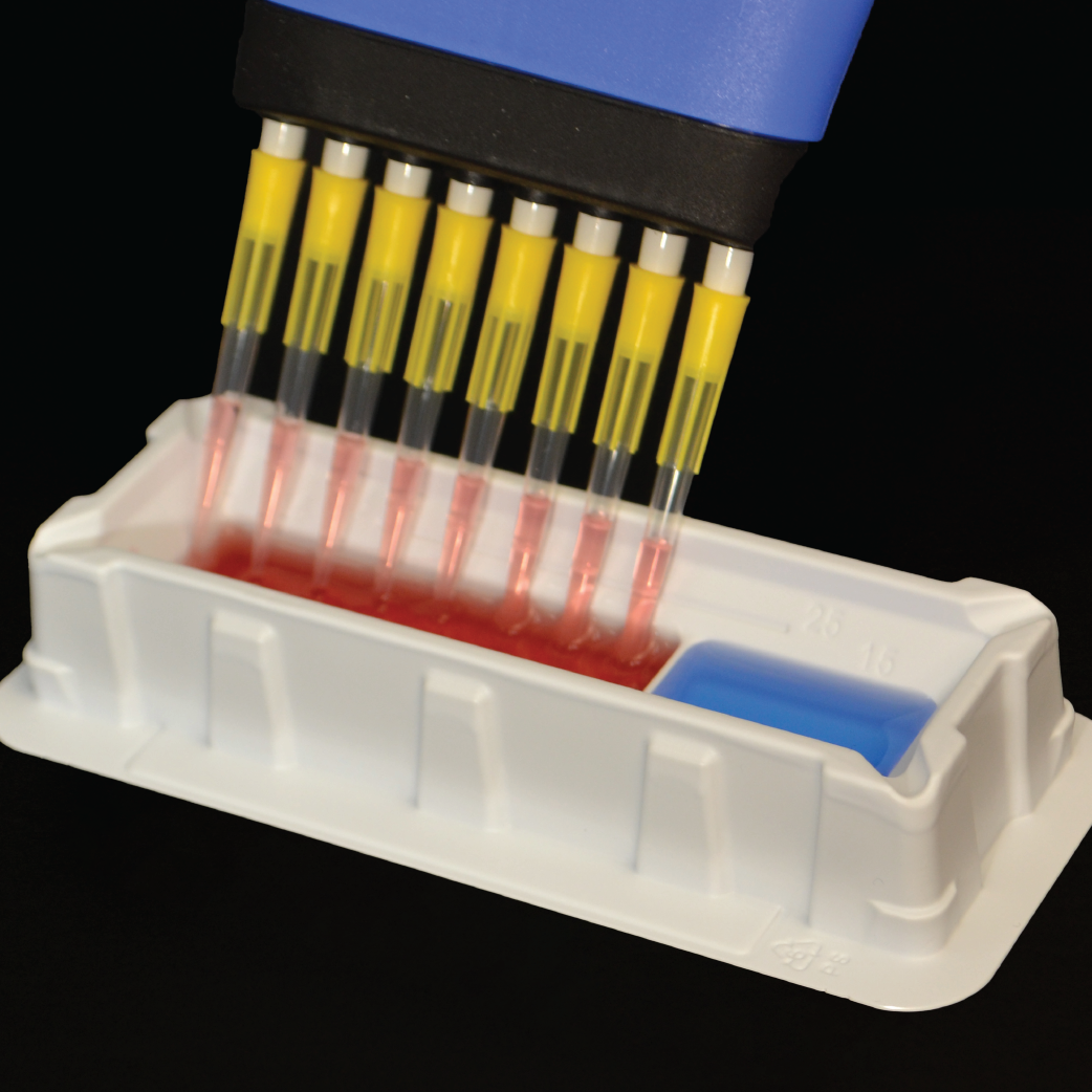 Thermoformed with Virgin Resin, Certified RNase/DNase Free. Non-Pyrogenic, Animal Free, Human DNA Free. Engineered to accommodate single and multichannel pipettors. Stacking lugs to ease separation and prevent crushing. Pour off spouts in each corner. Customization available for the reservoir packaging and heat sealing.